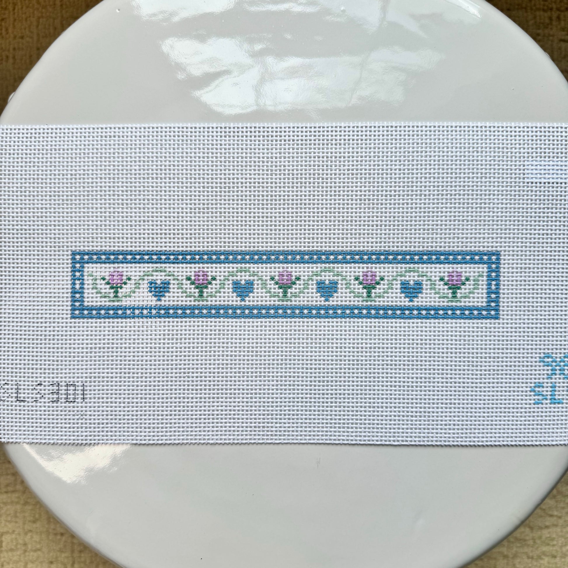 The design area measures 7 5/8" w 1 3/16"h. 13 mesh.
