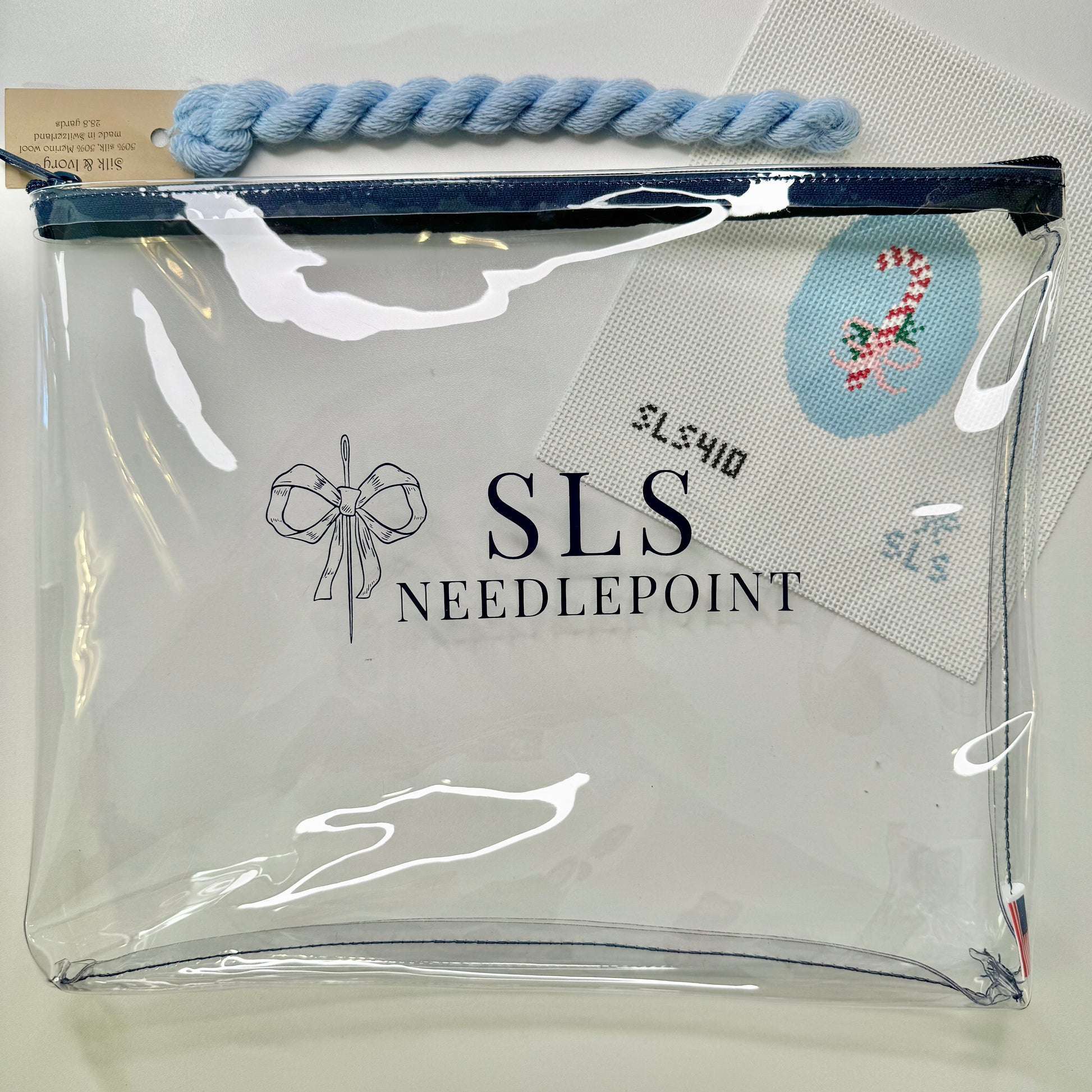 SLS Needlepoint project bag with navy logo and zipper. Find your projects easily and keep them safe with waterproof vinyl. Gusseted for maximum storage. Smooth zipper closure. Made in the USA. Bag shown in the main photo is the Large Project Pouch. Skein of Silk & Ivory for size.